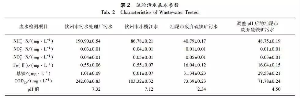試驗污水分別為廣西壯族自治區(qū)欽州市污水處理廠的生化池進(jìn)水、欽州市小欖江水以及廣東省汕尾市廢棄硫鐵礦區(qū)的地表水。三種試驗污水的基本理化性質(zhì)如表2所示。由于汕尾廢棄硫鐵礦污水的pH值比較低,本研究根據(jù)厭氧鐵氨氧化菌生長的適宜pH,在汕尾廢棄硫鐵礦污水中加入氫氧化鈉(1 mol/L),將污水pH調(diào)至4.5,后作為第四種試驗廢水參與整個研究(如表2所示)。