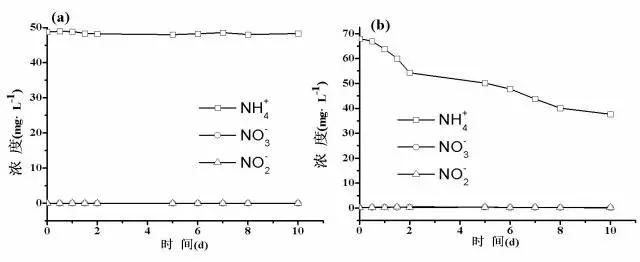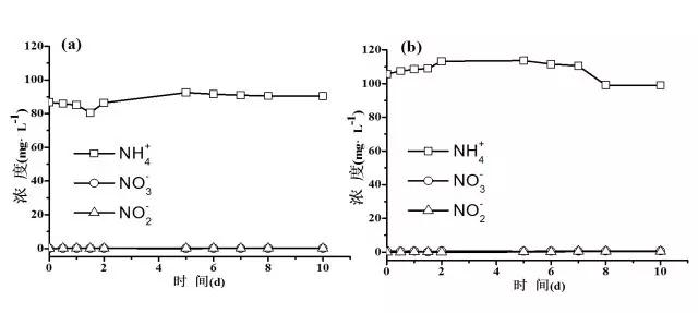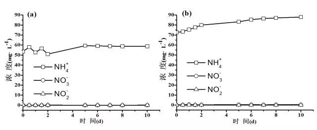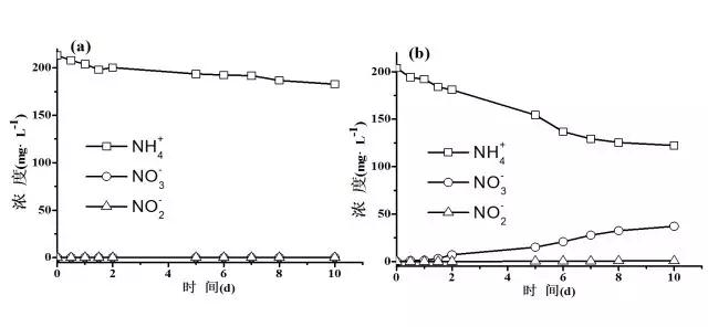 圖1 欽州污水廠進(jìn)水中氮元素的轉(zhuǎn)化:(a)未加菌液;(b)添加菌液