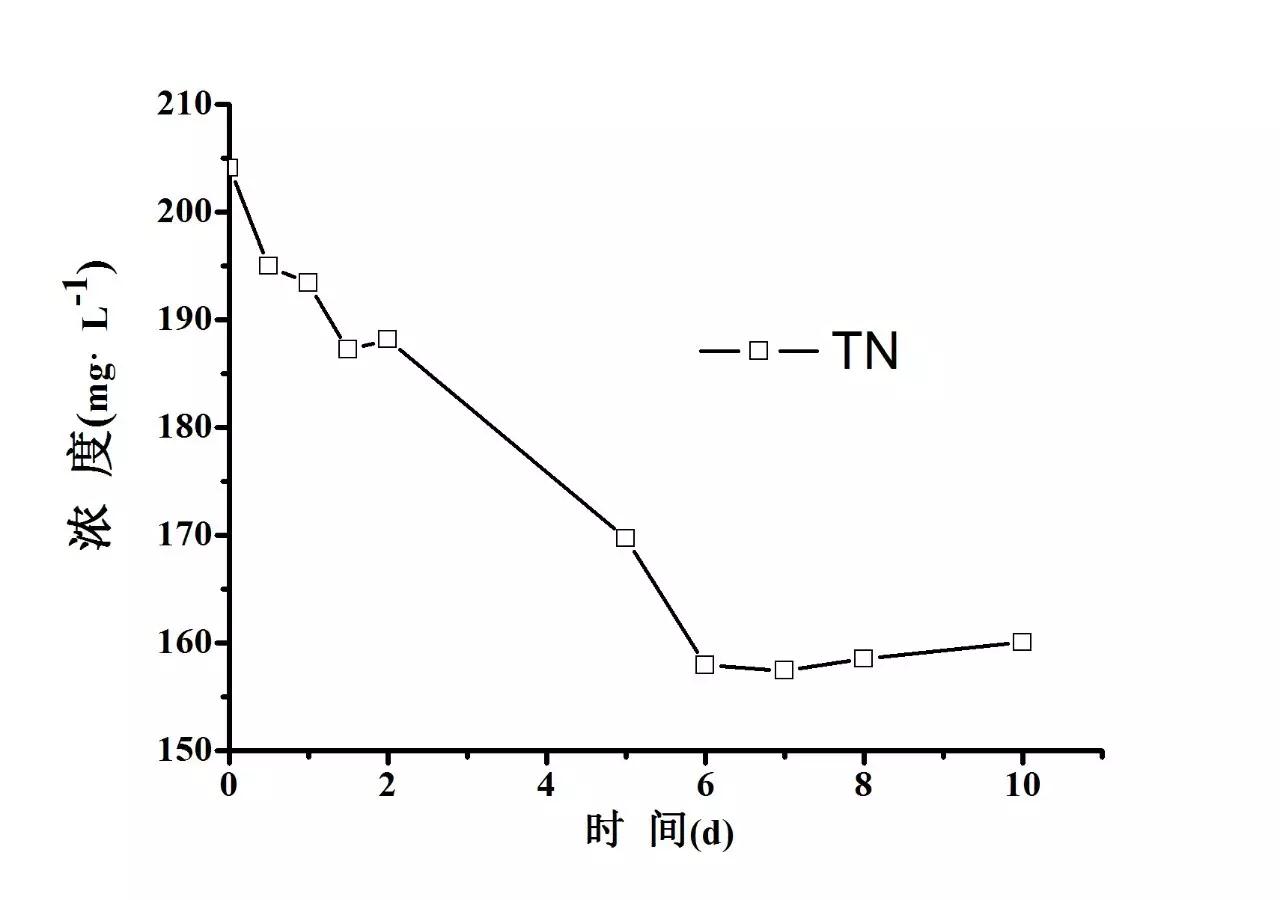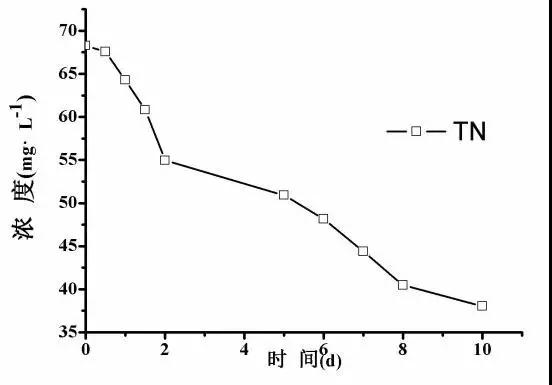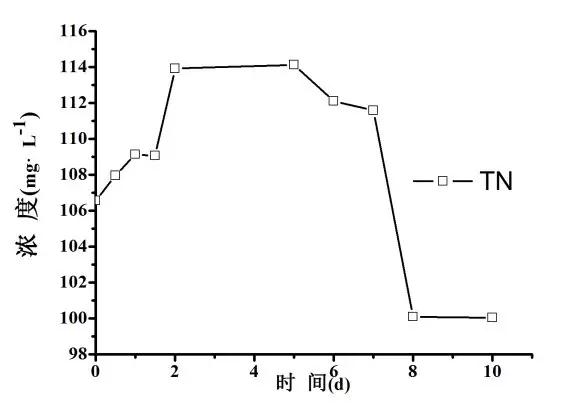 欽州小欖江水中氮的轉(zhuǎn)化如圖4所示。在培養(yǎng)過程中氨氮的變化分成兩個階段:第一階段為氨氮升高階段(0~5 d),在此階段,污水中的氨氮濃度由初始的105.73 mg/L升至5 d時的113.58 mg/L,加入菌液的污水中氨氮和總氮均升高,原因可能是菌液中部分細(xì)菌死亡,釋放出氨氮,導(dǎo)致污水中的氨氮和總氮升高;第二階段為氨氮下降階段(5~10 d),污水中的氨氮濃度由5 d時的113.58 mg/L降至10 d時的98.97 mg/L,與此同時,5~10 d內(nèi),水中的硝態(tài)氮沒有明顯變化,而亞硝態(tài)氮由0.05 mg/L增長至0.37 mg/L。根據(jù)加入菌液后總氮的變化(如圖5所示)得出,水中減少的氨氮部分轉(zhuǎn)化為NO2--N,另一部分極可能轉(zhuǎn)化為氮?dú)?,轉(zhuǎn)化量為6.44 mg/L。