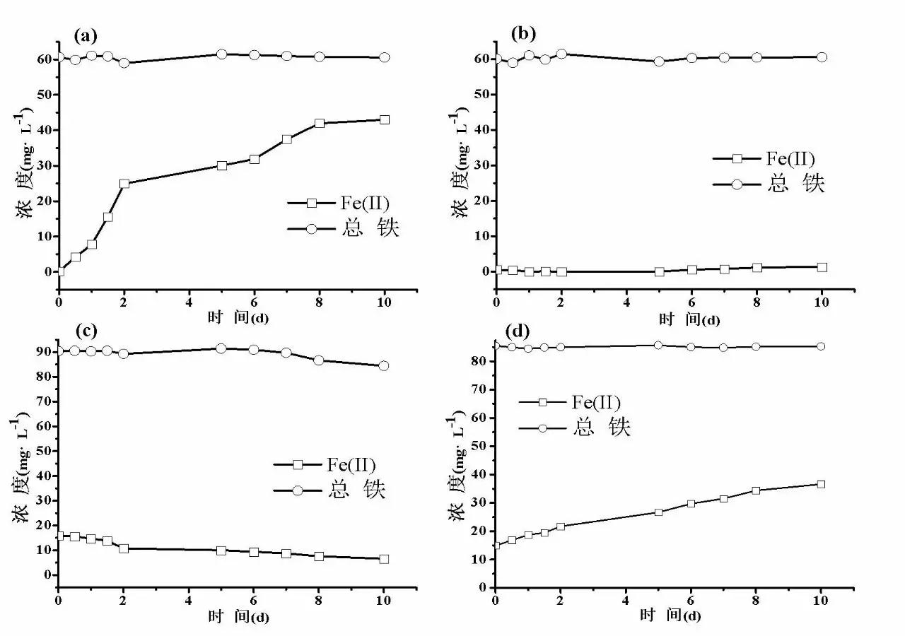 圖3 三種類型的污水添加菌液后鐵形態(tài)的轉(zhuǎn)化:(a)欽州污水處理廠進(jìn)水;(b)欽州小欖江水;(c)汕尾廢棄硫鐵礦污水;(d)調(diào)整pH值后的汕尾市廢棄硫鐵礦污水