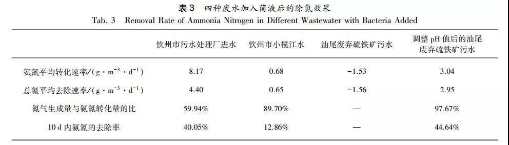 由表3可知,添加菌液后氨氮轉(zhuǎn)化速率大小依次是欽州污水廠進(jìn)水、調(diào)節(jié)pH后汕尾硫鐵礦廢水和小欖江水,平均速率分別為8.17g˙m-3˙d-1、3.04g˙m-3˙d-1和0.68g˙m-3˙d-1。與氨氮轉(zhuǎn)化速率大小類似,總氮去除率也是欽州污水廠進(jìn)水>調(diào)節(jié)pH后汕尾硫鐵礦廢水>小欖江水,速率分別為4.4g˙m-3˙d-1、2.95g˙m-3˙d-1和0.65g˙m-3˙d-1。在本試驗中,三種污水加入菌液后氮?dú)舛际前钡闹饕D(zhuǎn)化產(chǎn)物。欽州污水廠水、小欖江污水和調(diào)節(jié)pH后汕尾硫鐵礦廢水分別為59.94%、89.70%和97.67%。而在10d內(nèi)欽州污水廠進(jìn)水、小欖江污水和調(diào)節(jié)pH后汕尾硫鐵礦廢水加入菌液后氨氮轉(zhuǎn)化率分別為40.05%、12.86%和44.64%。