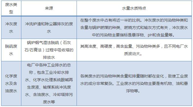 電廠(chǎng)廢水來(lái)源廣泛,主要分為以下幾類(lèi):沖灰廢水、脫硫廢水、工業(yè)廢水(化學(xué)廢水及含油廢水)。與化工、造紙等工業(yè)廢水相比,火電廠(chǎng)的廢水有以下特點(diǎn):水質(zhì)水量差異很大,劃分的廢水的種類(lèi)較多;廢水中的污染成分以無(wú)機(jī)物為主,有機(jī)污染物主要是油;間斷性排水較多。電廠(chǎng)廢水來(lái)源及水質(zhì)特點(diǎn)總結(jié)于下表。