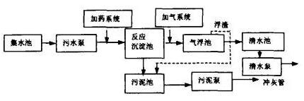 此法采用SPD型高效氣浮裝置,利用其特殊的“零速度”原理:原水從氣浮池中心旋轉(zhuǎn)頭進(jìn)入,通過(guò)配水器布水,配水器移動(dòng)速度和進(jìn)水的流速相同,方向相反,產(chǎn)生了“零速度”,這樣進(jìn)水不會(huì)對(duì)原水產(chǎn)生擾動(dòng),使得顆粒的懸浮和沉降在一種靜態(tài)下進(jìn)行。