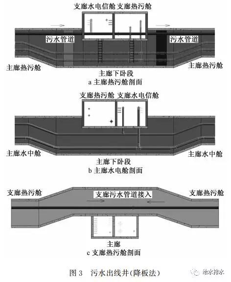 降板法出線,即在污水出線位置管廊底板下臥,除污水外,其余管線沿底板下臥,上部空間為污水單獨(dú)使用,并根據(jù)需要將頂板局部下降,以便于污水支管的預(yù)留以及檢查井的設(shè)置(見圖3)。