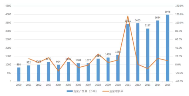 根據(jù)環(huán)保部公布的各年度環(huán)境統(tǒng)計(jì)年報(bào),我國(guó)工業(yè)危險(xiǎn)廢物年產(chǎn)生量處于上下小幅波動(dòng)、整體逐步遞增的狀態(tài)。據(jù)統(tǒng)計(jì),2015年我國(guó)危險(xiǎn)廢物的產(chǎn)生量為3976.1萬噸。