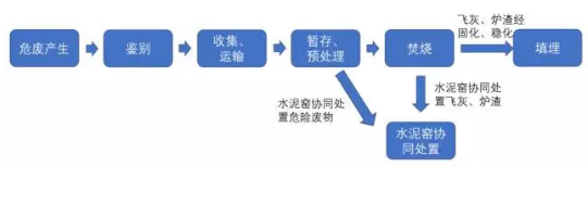 危險(xiǎn)廢物終端處置方式主要為焚燒和安全填埋,同時(shí)水泥窯協(xié)同處置、等離子體技術(shù)等也逐漸發(fā)展應(yīng)用于實(shí)際。焚燒中產(chǎn)生的飛灰和爐渣會(huì)經(jīng)過固化、穩(wěn)化等技術(shù)處理后,進(jìn)入填埋場(chǎng)。危險(xiǎn)廢物焚燒和水泥窯協(xié)同處置本質(zhì)上都屬于高溫處理技術(shù),兩種處置方法全鏈條可簡(jiǎn)化為下圖: