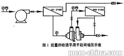 反滲透裝置脫鹽部分與或級與級之間,可使用能量回收透平,以提高下一段或級的進水壓力,提高產(chǎn)水量。原理示意見圖1。Steven J.Duranceau等報道,1996年佛里達水服務(wù)公司在Marco島對現(xiàn)有15000m3/d苦堿水淡化進行改造,通過使用段之間的能量回收透平,使系統(tǒng)的產(chǎn)水量增加3780m3/d,增幅達25%。