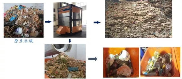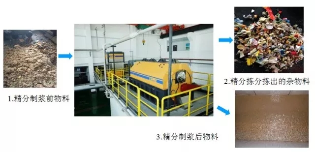 精分制漿機(jī)對物料進(jìn)行二次雜物分揀及破碎制漿,將物料中粒徑大小在20mm以上的雜物分離出系統(tǒng),如垃圾中的塑料、竹木、陶瓷、玻璃瓶、瓶蓋、筷子、骨頭以及貝殼等海鮮類硬物質(zhì)雜物,雜物外運(yùn)處理。同時(shí)對大塊有機(jī)質(zhì)進(jìn)行破碎得到以有機(jī)質(zhì)8mm以下粒度的漿狀物料為主的均質(zhì)物料。