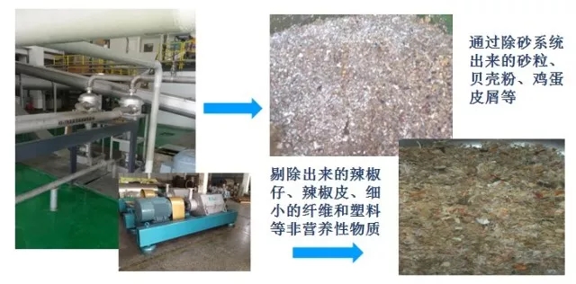 除砂裝置有效去除有機(jī)漿料中沙粒、貝殼、玻璃、瓷片、砂石等砂質(zhì)雜物,除砂后的物料經(jīng)除雜分離機(jī)分離出細(xì)纖維、塑料等輕飄物,雜物外運(yùn)。