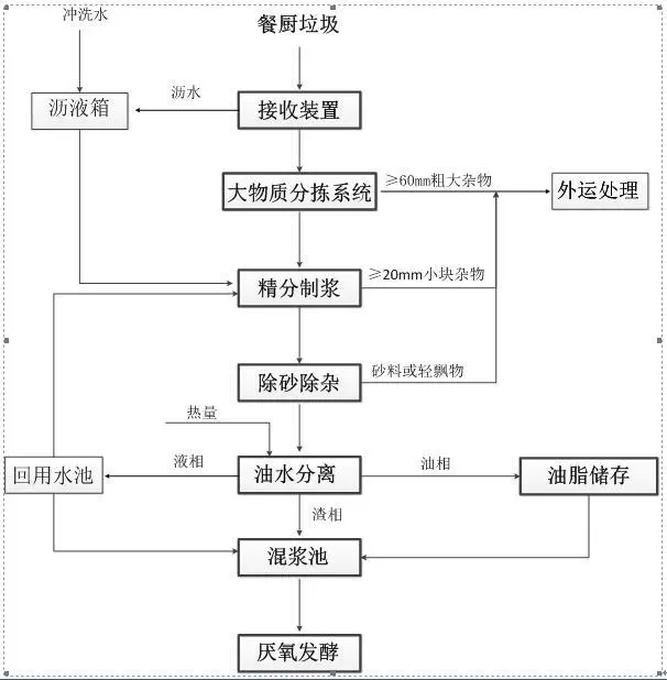 慈溪餐廚垃圾預(yù)處理工藝采用機(jī)械精細(xì)化分揀制漿工藝,即“物料接收+大物質(zhì)分揀+精分制漿+除砂除雜+油水分離”工藝,通過大物質(zhì)分揀+精分制漿+除砂除雜逐級減量化設(shè)計(jì),可有效去除物料中的雜物,保證了最大化地將一些對后道工序設(shè)備損壞最大的硬性物質(zhì)如:瓷盤、玻璃瓶、金屬物質(zhì)、貝殼、骨頭等和纖維類輕性物質(zhì)如:塑料、餐巾以及砂粒和輕飄物如塑料、辣椒籽、木質(zhì)纖維等有效地分離出來,得到的液相做油脂分離,避免這些物質(zhì)對輸送泵組、離心提油設(shè)備的磨損和堵塞。