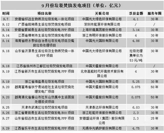 據(jù)不完全數(shù)據(jù)顯示,2017年9月共公開(kāi)了15個(gè)垃圾焚燒發(fā)電項(xiàng)目,涉及金額超40億。中國(guó)光大綠色環(huán)保有限公司公開(kāi)的3個(gè)新項(xiàng)目,總投資逾9億元,浙江省海鹽縣的垃圾發(fā)電項(xiàng)目單筆價(jià)值也在5億左右,江西樂(lè)平市垃圾焚燒項(xiàng)目也預(yù)計(jì)投資約4.7億元。