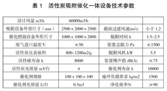 項目采用吸附濃縮+催化燃燒組合工藝,活性炭對VOCs吸附濃縮,脫附后可重復使用,脫附下來的濃縮VOCs通過催化劑電加熱實現(xiàn)低溫燃燒,達到處理污染物的目的,燃燒熱風循環(huán)使用于活性炭脫附,達到節(jié)能目的。設備具體特性如下: