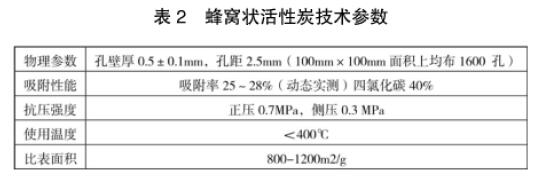 b)吸附箱采用抽屜式結(jié)構(gòu),裝填方便、便于更換。采用新型的活性炭吸附材料——蜂窩狀活性炭,與粒狀相比具有優(yōu)越的動力學性能。極適合于大風量下使用。由于其比重為條形活性炭纖維的8-10倍,再生前吸附有機溶劑可以達到活性炭總重量的25%,具有使用壽命長,吸附系統(tǒng)運行阻力低,凈化效率高等特點。蜂窩活性炭主要技術(shù)參數(shù)如表2所示: