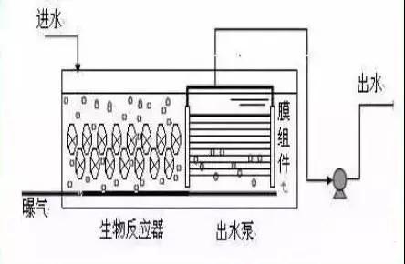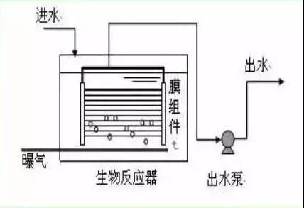 把膜組件置于生物反應(yīng)器內(nèi)部。進(jìn)水進(jìn)入膜--生物反應(yīng)器,其中的大部分污染物被混合液中的活性污泥去除,再在外壓作用下由膜過(guò)濾出水。