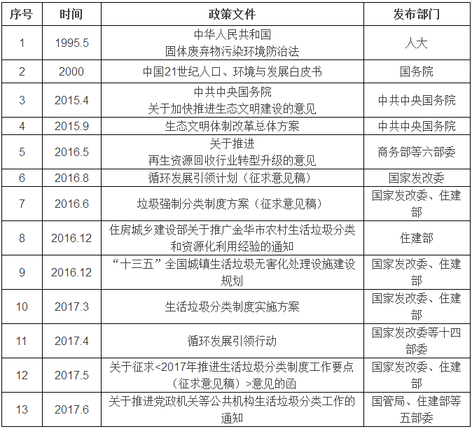 2017年4月21日,發(fā)改委等十四部委聯(lián)合發(fā)布了《循環(huán)發(fā)展引領(lǐng)行動(dòng)》,,實(shí)現(xiàn)生活垃圾分類和再生資源回收有效銜接提出了具體的工作計(jì)劃,如加強(qiáng)城市低值廢棄物資源化利用,創(chuàng)新服務(wù)機(jī)制和模式;健全法規(guī)體系,研究出臺(tái)強(qiáng)制回收的產(chǎn)品和包裝物名錄及管理辦法、建筑垃圾回收與資源化利用管理辦法;理順價(jià)格稅費(fèi)政策,探索垃圾計(jì)量收費(fèi)等。
