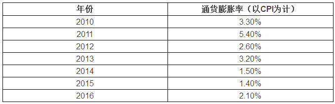 根據(jù)國家統(tǒng)計(jì)局官方數(shù)據(jù),2010-2016年的通貨膨脹率如下: