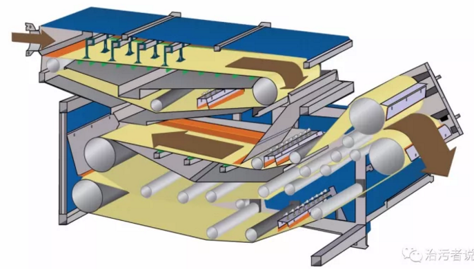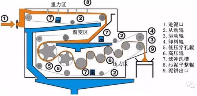 這是一個(gè)典型的濃縮壓濾一體機(jī)的構(gòu)造圖,從污泥濃縮壓濾一體機(jī)的結(jié)構(gòu)上來(lái)看,壓濾機(jī)分為三個(gè)部分,一部分是重力區(qū),在這個(gè)區(qū)間,主要是加了絮凝劑的污泥在污泥平攤輥的作用下,平攤到壓濾機(jī)上部平整的濾帶上,這部分濾帶沒(méi)有擠壓作用,僅僅是依靠加藥后的污泥和水分離開(kāi),水依靠重力作用通過(guò)濾帶流走的;第二部分進(jìn)入漸變區(qū),這個(gè)區(qū)域,開(kāi)始有了第二條濾帶參與進(jìn)來(lái),污泥開(kāi)始進(jìn)入到一個(gè)上下兩條帶之間的位置,并逐漸受到上下兩條濾帶的包圍,并由寬變窄,形成一個(gè)漸變的區(qū)域,在這部分區(qū)域的污泥之間的水分在漸變的過(guò)程中得到一定的去除;第三部分進(jìn)入壓力區(qū),這部分濾帶上下開(kāi)始強(qiáng)力擠壓,污泥中被絮凝藥劑剝離的顆粒之間的水分在壓力作用下從污泥中擠壓出去,通過(guò)濾帶流走。