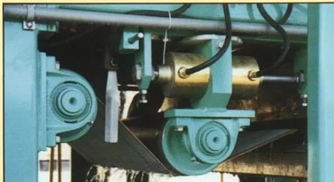 在脫水機(jī)的濾帶兩側(cè),各裝有一個(gè)限位開(kāi)關(guān),和濾帶保持一定的距離,在濾帶碰觸到限位開(kāi)關(guān)以后,限位開(kāi)關(guān)給糾偏氣缸的空氣電動(dòng)閥一個(gè)開(kāi)啟信號(hào),糾偏氣缸開(kāi)始動(dòng)作,推動(dòng)糾偏輥?zhàn)樱瑸V帶在糾偏輥?zhàn)拥膸?dòng)下,回歸到正常的位置,完成一次完整的糾偏。帶式壓濾脫水機(jī)在運(yùn)行中,不斷的進(jìn)行糾偏動(dòng)作,對(duì)跑偏的濾帶進(jìn)行糾偏,從而保證了帶式壓濾機(jī)的正常穩(wěn)定的運(yùn)行。