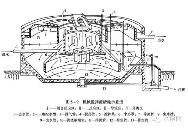 機械攪拌澄清池將混合、絮凝反應(yīng)及沉淀工藝綜合在一起,組成示意見圖5—9。池中心有一個轉(zhuǎn)動葉輪,將原水和加人藥劑及澄清區(qū)沉降下來的回流污泥混合,促進形成較大絮體。污泥回流量是進水量的3~5倍,為保持池內(nèi)懸浮物濃度穩(wěn)定,要及時排出多余的污泥。