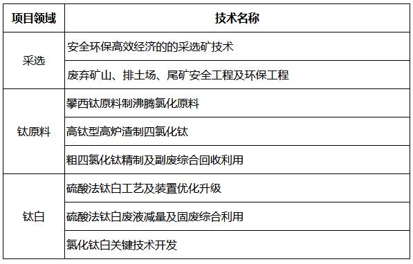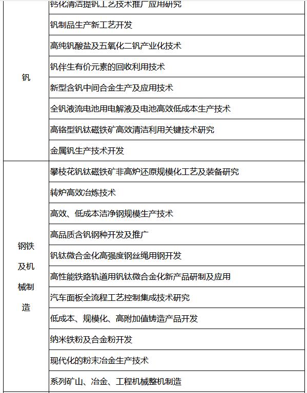 3.科技攻關(guān)自主創(chuàng)新目標(biāo):重點突破攀西礦制取富鈦料、氯化法鈦白、低品位礦高效利用、非高爐冶煉等一批核心關(guān)鍵技術(shù),實現(xiàn)氧化釩清潔生產(chǎn)工藝、釩電池、高鈦型高爐渣回收利用等新技術(shù)產(chǎn)業(yè)化應(yīng)用。