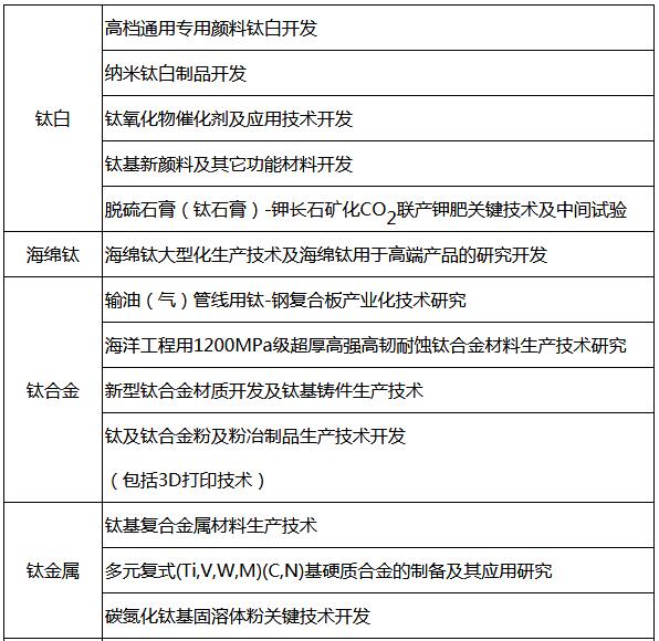 重點開發(fā):高檔鈦白、納米二氧化鈦、鈦粉(3D打印材料)、鈦及鈦合金材、鈦基復(fù)合材料(如鈦-鋼鐵復(fù)合材料、鈦-無機非金屬材料)、鈦功能材料(如鈦催化材料)、鈦鋁基多元合金材料(如摻稀土的鈦鋁合金材料)。艦船結(jié)構(gòu)、海水淡化用鈦板/管,石油工程用鈦油井管、耐蝕集輸管,汽車發(fā)動機用鈦鋁合金,煉化、化工用鈦及鈦鋼復(fù)合板/管。
