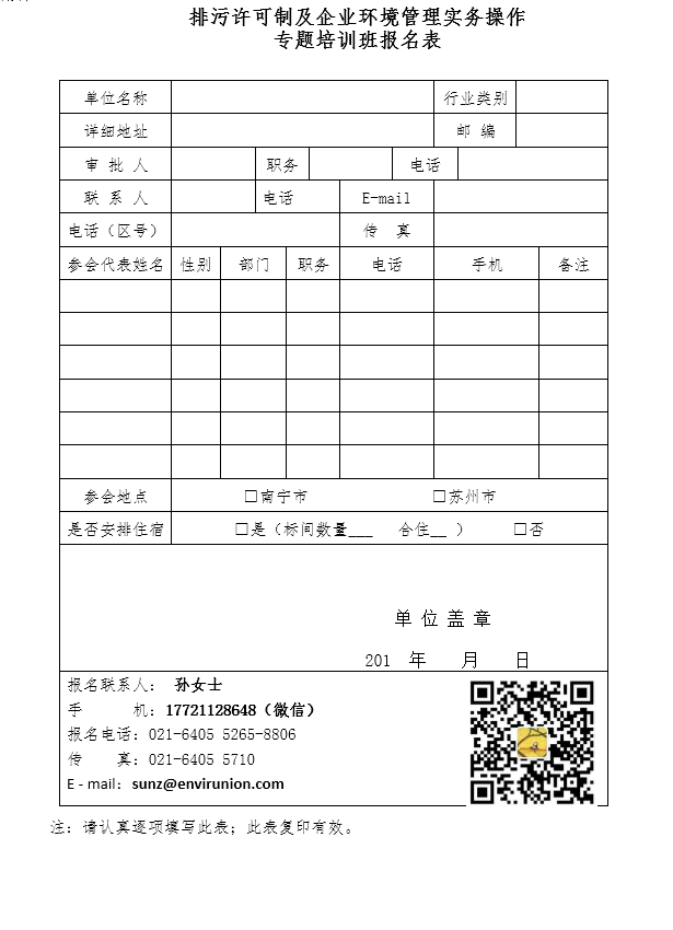 附件:關(guān)于舉辦排污許可制及企業(yè)環(huán)境管理實(shí)務(wù)操作專題培訓(xùn)班報名表