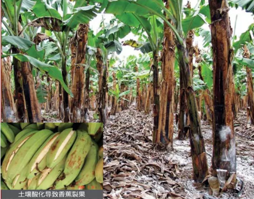 在廣西金穗香蕉公司發(fā)現(xiàn)的裂果香蕉,上億元的香蕉因此爛掉了。經(jīng)我們測(cè)試,種植香蕉的土壤很酸,特別是種植時(shí)候要挖深溝,深溝里的生土pH 值只有3 點(diǎn)多到4 點(diǎn)多,鈣鎂吸收量非常低,果皮韌性差,在水分比較多的時(shí)候,果肉膨脹得快,果皮膨脹慢,就會(huì)裂果。后經(jīng)我們的優(yōu)化肥料配方和改良土壤,給金穗公司節(jié)省1800 多萬(wàn)元成本,徹底解決了裂果問(wèn)題。公司也建立了一個(gè)有機(jī)肥堆肥廠,生產(chǎn)有機(jī)肥,再施加石灰,來(lái)改造酸性土壤。