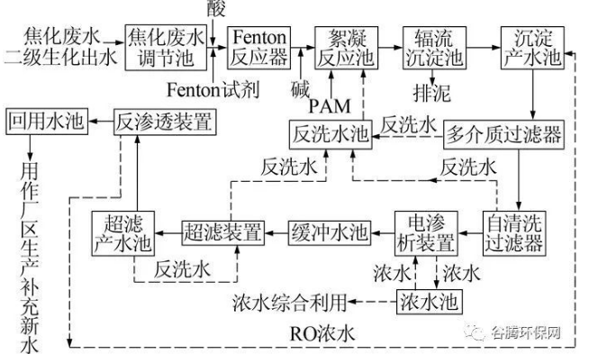焦化廢水二級生化出水深度處理系統(tǒng)的外排濃水經(jīng)混合后自流進入焦化廢水調(diào)節(jié)池, 調(diào)節(jié)水量及水質(zhì)后經(jīng)泵加壓提升進入Fenton 反應(yīng)器,加酸控制Fenton 反應(yīng)器的進水pH 并投加Fenton 試劑,其出水進入絮凝反應(yīng)池,加堿調(diào)節(jié)使絮凝反應(yīng)池進水呈中性, 同時投加PAM 強化絮凝, 出水進入輻流沉淀池,沉淀池出水進入沉淀產(chǎn)水池,再次加壓提升后依次通過多介質(zhì)過濾器及自清洗過濾器進行預(yù)過濾,出水進入電滲析裝置進行初次脫鹽,其出水進入緩沖水池,電滲析裝置的濃水排入濃水池供內(nèi)循環(huán)利用, 多余濃水排出系統(tǒng)進行綜合利用, 緩沖水池的出水經(jīng)泵提升后進入超濾裝置,出水進入超濾產(chǎn)水池,超濾產(chǎn)水池出水經(jīng)泵提升通過保安過濾器后進入反滲透裝置進行再次脫鹽,出水進入回用水池,作為廠區(qū)生產(chǎn)補充新水使用, 反滲透裝置濃水回流至沉淀產(chǎn)水池進行再次循環(huán)脫鹽。
