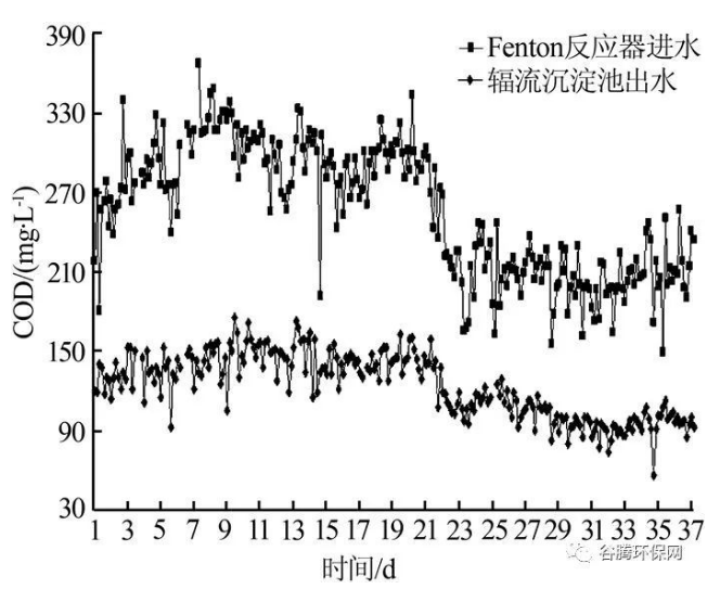 流沉淀池是利用物理吸附、架橋、沉淀作用,通過投加混凝劑或助凝劑實現(xiàn)對污染物的強化分離去除。該工程廢水經(jīng)調(diào)節(jié)池(水力停留時間為8.2 h)進行水質(zhì)水量調(diào)節(jié)后, 進入Fenton 反應(yīng)器。投加H2SO4調(diào)節(jié)Fenton 反應(yīng)器(HRT=2~3 min)的進水pH為2.5~3.0, 控制H2O2與FeSO4的投加量分別為0.7~1.2、2.1~3.1 g/L;絮凝反應(yīng)池的反應(yīng)時間設(shè)置為0.17 h,PAM投加量為4~6 mg/L, 其進水投加NaOH來調(diào)節(jié)廢水pH 至中性; 輻流沉淀池的水力負(fù)荷為0.85 m3/(m2˙h), 沉淀時間設(shè)置為4.05 h。廢水經(jīng)Fenton 反應(yīng)器、絮凝反應(yīng)池、輻流沉淀池處理后對COD 的去除效果如圖2所示。