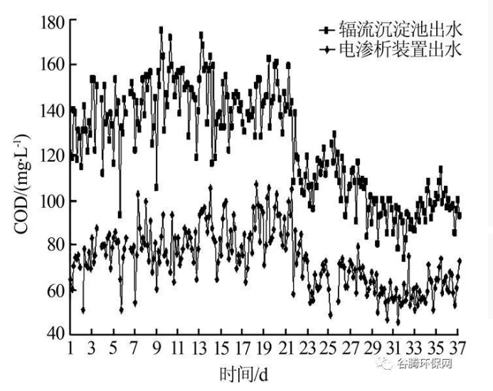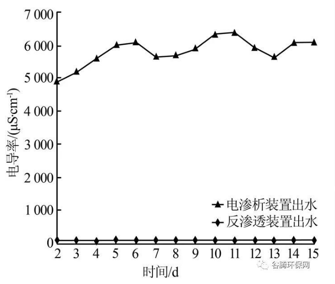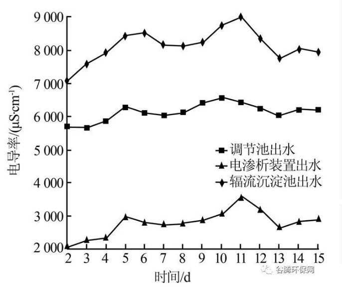 從圖3 可知, 在輻流沉淀池出水COD 平均為107.1 mg/L 條件下,電滲析裝置出水的COD 平均為77.84 mg/L,平均去除率為27.3%,說明多介質(zhì)過濾器、自清洗過濾器對輻流沉淀池出水COD 去除效果穩(wěn)定,可以保證電滲析裝置正常運行。根據(jù)工程實際運行工況,電滲析裝置的清洗周期一般為2 個月。從圖4 可知,該工藝的調(diào)節(jié)池出水、輻流沉淀池出水、電滲析裝置出水的電導(dǎo)率分別在5 672~6 573、7 090~9 002、2 127~3 600 μS/cm范圍內(nèi)。由于在Fenton 反應(yīng)器進水投加硫酸、絮凝反應(yīng)池進水投加NaOH,導(dǎo)致輻流沉淀池出水平均電導(dǎo)率較調(diào)節(jié)池出水高31.4%,但經(jīng)過初次脫鹽后,電滲析裝置出水平均電導(dǎo)率較調(diào)節(jié)池出水低53.2%,脫鹽效果顯著,緩解了后續(xù)反滲透膜的脫鹽壓力。