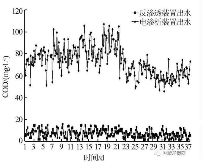2.3 超濾裝置、反滲透裝置:超濾裝置作為反滲透裝置的預(yù)處理裝置, 為反滲透裝置提供濁度<0.2 NTU、SDI<3 的進水,在降低反滲透裝置的化學(xué)清洗頻率、延長反滲透膜的使用壽命及保障反滲透系統(tǒng)的穩(wěn)定運行等方面起到保安作用。反滲透裝置作為二級脫鹽裝置,可將廢水中剩余的溶解鹽、膠體、有機物等去除。該工程采用的超濾膜材質(zhì)為聚偏氟乙烯(PVDF)膜,膜數(shù)量為60 支/套、平均運行通量為60 L/(m2˙h)、產(chǎn)水量為180 m3/(h˙套),共2 套,超濾產(chǎn)水進入超濾產(chǎn)水池(ht為0.67 h)。反滲透裝置前設(shè)置保安過濾器,孔徑為5 μm,共2 臺。反滲透裝置采用渦卷式反滲透膜,膜數(shù)量為204 支/套、回收率70%、平均運行通量為15 L/(m2˙h)、產(chǎn)水量為113 m3/(h˙套),共2 套。廢水經(jīng)超濾裝置、反滲透裝置處理后對COD、電導(dǎo)率的去除效果如圖5、圖6 所示。