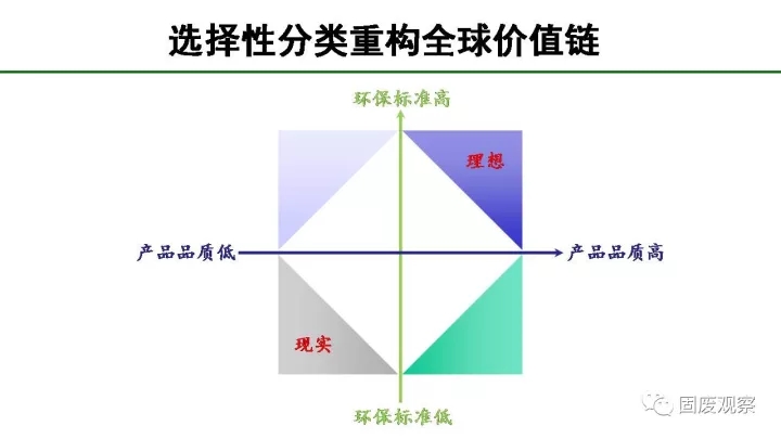 垃圾中的可回收物通常只能降級利用,產(chǎn)業(yè)集聚度和技術(shù)含量低,處于全球價值鏈的低端。如果我們僅把這些可回收物當作資源來考慮,為什么發(fā)達國家將產(chǎn)業(yè)鏈最低端的可回收物出口到我們國家,這種不公平的全球價值鏈,我們應(yīng)該重構(gòu)!