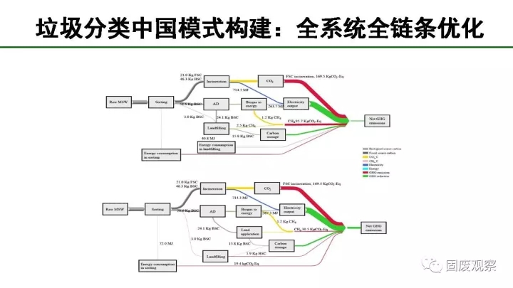 另外,系統(tǒng)性地看待垃圾分類,我們不能為填埋而填埋,為焚燒而焚燒。通過垃圾的物質(zhì)流,我們可以識別出物質(zhì)如何流動的,轉(zhuǎn)化效率如何,是否能被監(jiān)控,下面是我做的一個垃圾的物質(zhì)流。