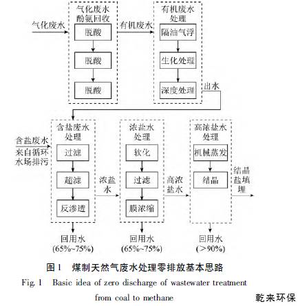 煤炭科學(xué)技術(shù)研究院有限公司針對煤化工含酚廢水提出了新型高效絡(luò)合萃取脫酚技術(shù),并開發(fā)了專有萃取劑,出水總酚可控制在300 mg /L 以內(nèi),較國內(nèi)傳統(tǒng)技術(shù)出水1 000 mg /L 有較大進步[3-6]。針對廢水回用過程中濃鹽水COD 難以脫除的問題,段鋒等[7]提出了“混凝+活性炭吸附”聯(lián)用工藝處理煤化工高含鹽廢水的工藝,可有效去除煤化工高含鹽廢水COD。針對結(jié)晶雜鹽的處置,權(quán)秋紅等[8]、陳業(yè)鋼等[9]分別提出了分鹽結(jié)晶工藝,通過蒸發(fā)結(jié)晶工藝將高濃鹽水結(jié)晶分離出純凈的NaCl 和Na2SO4,對結(jié)晶鹽進行資源化處理。筆者對煤制天然氣廢水處理各工序技術(shù)特點及存在問題進行分析,對煤制天然氣及煤化工廢水零排放處理發(fā)展趨勢進行總結(jié)與展望,以期促進煤制天然氣項目的“廢水零排放”的實現(xiàn)。