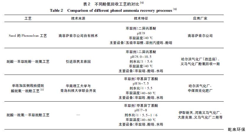 酚氨回收處理代表工藝有脫酸—萃取脫酚—脫氨工藝、脫酸—脫氨—萃取脫酚工藝、單塔加壓側(cè)線抽提( 酸性氣體、氨同塔脫除) —萃取脫酚工藝和南非薩索爾公司Phenosolvan 工藝。不同酚氨回收工藝對比見表2[10]。