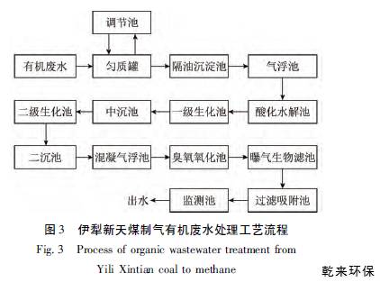 煤制氣有機廢水處理通常由“預(yù)處理+生化處理+ 深度處理”組成,該廢水主要特征是: ① 高COD,含量為3 500 mg /L; ② 高氨氮,250 mg /L 左右; ③ 有機污染物復(fù)雜,含有苯類烴、萘、多元酚、吡啶、噻吩等; ④ 毒性大,含有酚、氰化物、硫化物等有毒有害物質(zhì); ⑤ 可生化性低,BOD5 /COD( 5 日生化需氧量與化學(xué)需氧量的比值,是污水可生化降解性的指標(biāo)) 在0. 3 以下。