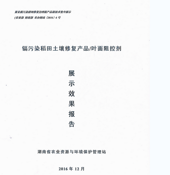 2016年參加由農(nóng)業(yè)部、財政部組織的重金屬污染耕地修復(fù)治理新產(chǎn)品新技術(shù)集中展示,通過專家篩選和評審,早晚稻平均稻米降隔率≥50%;