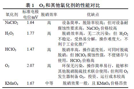 近幾年,關(guān)于O3氧化結(jié)合堿液吸收的新技術(shù)越來越多,MING等[34]開展了O3氧化與NaOH溶液吸收耦合的同時脫硫脫硝技術(shù)研究;SUN等[35]利用堿性的氧化鎂漿料作為吸收劑,研究了O3氧化協(xié)同氧化鎂漿液吸收的同時脫硫脫硝新工藝。O3可以很好地的和不同吸收劑及其他技術(shù)協(xié)調(diào)使用,擁有很強(qiáng)的使用靈活性,這為其應(yīng)用推廣提供了便利,O3氧化法應(yīng)用的關(guān)鍵在于如何降低O3的制取成本。O3和其他氧化劑的性能對比見表1。