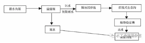 根據(jù)大漁村的土地利用情況與排水系統(tǒng)現(xiàn)狀,采用隔油沉砂池+生態(tài)溝+植物穩(wěn)定塘的“三池”處理系統(tǒng)。主要包含四個(gè)組分:溢流堰,隔油沉砂池,生態(tài)溝,植物穩(wěn)定塘。處理工藝流程如圖所示。