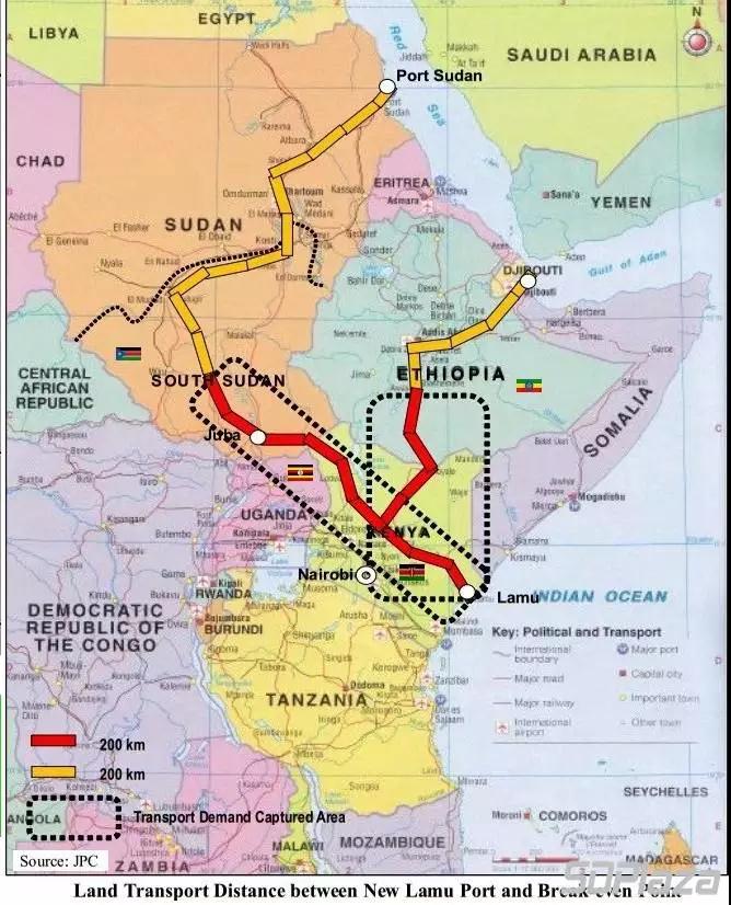 肯尼亞拉穆港-南蘇丹-埃塞俄比亞交通走廊項目(LAPSSET)耗資約250億美元,被認為是非洲國家獨立以來“非洲大陸最大工程”。該項目計劃建造一個擁有32個泊位的深水港,并建設(shè)連接港口與南蘇丹首都朱巴以及埃塞俄比亞首都亞的斯亞貝巴的高速公路、鐵路與輸油管道。新港口將配套建設(shè)煉油廠、倉庫等基礎(chǔ)設(shè)施,此外,還包括在拉穆(Lamu Islands)、伊西奧洛(Isiolo)、洛基察吉奧(Lokichogio)建設(shè)三個國際機場。