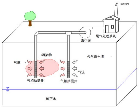 土壤氣相抽提技術(Soil Vapor Extraction,SVE)是一種處理非飽和區(qū)土壤揮發(fā)性有機物污染的技術,其利用抽真空或注入空氣在受污染區(qū)域誘導產(chǎn)生氣流,將被吸附的、溶解狀態(tài)的或者自由相的污染物轉變?yōu)闅庀?氣化),抽提到地面,然后再進行收集和處理。