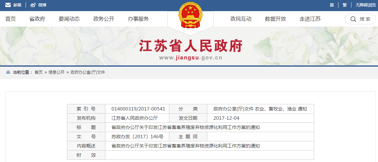 省政府辦公廳關于印發(fā)江蘇省畜禽養(yǎng)殖廢棄物資源化利用工作方案的通知