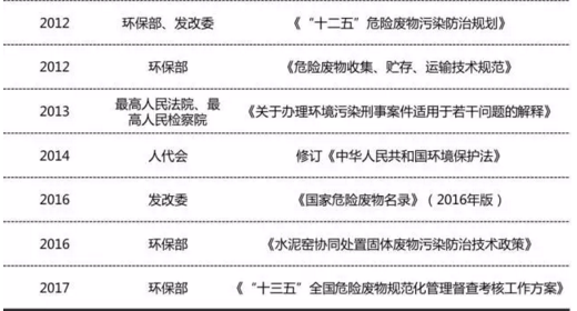 危廢政策不斷出臺,尤其是省級細(xì)則落地:1)2017年環(huán)保部出臺“十三五”全國危險(xiǎn)廢物規(guī)范化管理督查考核工作方案,各省近期均推出省級危廢規(guī)范化管理督查方案;2)《國家危險(xiǎn)廢物名錄》自2016年8月1日起施行;新修訂的《固體廢物污染環(huán)境防治法》取消危險(xiǎn)廢物省內(nèi)轉(zhuǎn)移審批手續(xù);3)2016年最高司法機(jī)關(guān)就環(huán)境污染犯罪出臺專門司法解釋;4)2018年起實(shí)施《環(huán)境保護(hù)稅法》,危廢稅額1000元/噸;5)環(huán)保部發(fā)布《水泥窯協(xié)同處置固體廢物污染防治技術(shù)政策》,支持水泥窯協(xié)同處置。