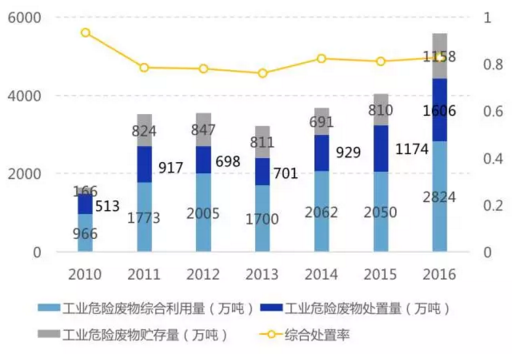 在環(huán)保監(jiān)管力度增強(qiáng),各省均推出省級督查方案背景下,危廢處置剛需再次提升,尤其是要求進(jìn)入規(guī)范渠道處置的量增加。但市場情況是,實(shí)際產(chǎn)生量遠(yuǎn)大于統(tǒng)計(jì)量(披露16年5347萬噸,預(yù)計(jì)實(shí)際8000萬噸),低綜合利用處置率(83%),低有效利用率(25%),導(dǎo)致整體危廢的處置供不應(yīng)求。