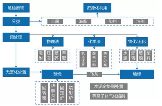 危廢基本處理步驟包括分類、預(yù)處理、最終處置。金屬、油脂、溶劑、染料等由回收利用價(jià)值的廢物可被資源化利用;預(yù)處理包括物理法、化學(xué)法,預(yù)處理后的危廢才能進(jìn)入焚燒或填埋等最終處置設(shè)施中。