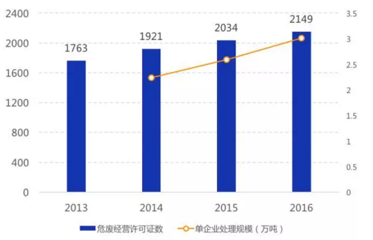 資質(zhì)企業(yè)平均規(guī)模較?。?016年我國持危險(xiǎn)廢棄物經(jīng)營許可證的企業(yè)數(shù)量為2149家,2016年凈增加僅115家,體現(xiàn)出環(huán)保系統(tǒng)對新頒發(fā)許可證愈發(fā)謹(jǐn)慎;平均每家處理量僅不到3萬噸,呈現(xiàn)較強(qiáng)的分散性特征,但單企業(yè)處理規(guī)模由2014年2.2萬噸/年增加到2016年3.0萬噸/年,未來隨著許可證頒發(fā)與復(fù)核難度加大,實(shí)力弱、技術(shù)差的小企業(yè)將被淘汰出市場,龍頭擴(kuò)張,單企業(yè)規(guī)模繼續(xù)擴(kuò)大。