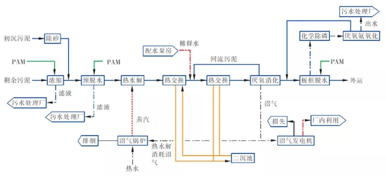 北京市某污水處理廠(chǎng)處理規(guī)模為60萬(wàn)噸,污泥產(chǎn)量約為878噸/日,同時(shí)接收其他廠(chǎng)外運(yùn)污泥342噸/日,總處理規(guī)模1220噸/日(以含水率80%計(jì),不含廠(chǎng)內(nèi)污泥系統(tǒng)回流量),污泥處理工藝采用濃縮+預(yù)脫水+熱水解+厭氧消化+板框脫水(見(jiàn)圖1)。剩余污泥進(jìn)入污泥濃縮、預(yù)脫水系統(tǒng),經(jīng)過(guò)濃縮機(jī)濃縮后,與經(jīng)過(guò)除砂的初沉污泥混合,利用預(yù)脫水機(jī)脫水與外廠(chǎng)輸送的脫水污泥混合后進(jìn)入熱水解系統(tǒng)。熱水解處理后的污泥經(jīng)過(guò)