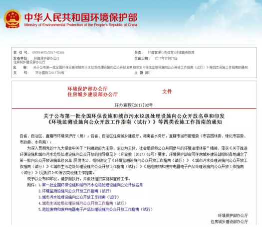 近日環(huán)保部發(fā)布了關于公布第一批全國環(huán)保設施和城市污水垃圾處理設施向公眾開放名單和印發(fā)《環(huán)境監(jiān)測設施向公眾開放工作指南(試行)》等四類設施工作指南的通知。