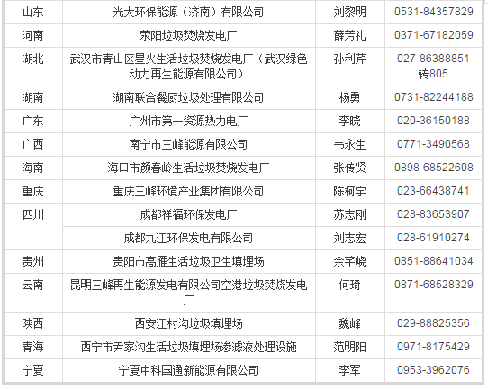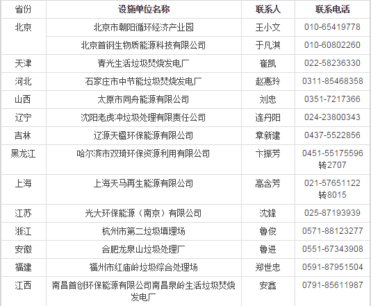 包括29個垃圾處理設施,其中垃圾焚燒設施21個,垃圾填埋設施6個,餐廚垃圾處理設施1個,滲濾液處理設施1個,分布于全國27個省、直轄市和自治區(qū),聯系人與聯系方式俱全。