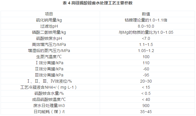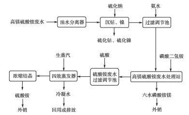 萃取單元產(chǎn)生的高鎂硫酸銨廢水預(yù)經(jīng)油水分離器除去有機(jī)相,然后用硫化鈉沉淀廢水中的鈷、鎳,濾渣返回生產(chǎn)系統(tǒng)再處理,濾液進(jìn)入貯水池中,用氨水調(diào)節(jié)廢液pH至8.0~10.0,通過磷酸二氫銨除鎂至1 mg/L以下,固液分離后濾液用硫酸回調(diào)pH至7.0以下,進(jìn)入四效逆流降膜蒸發(fā)器進(jìn)行濃縮,結(jié)晶分離,最后制得硫酸銨產(chǎn)品。